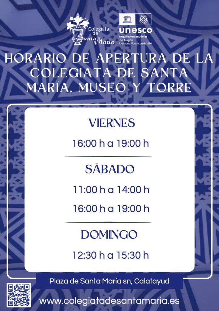 El recinto, que incluye la visita a la colegiata, el museo y la emblemática torre mudéjar, puede visitarse de viernes a domingo con los siguientes horarios: