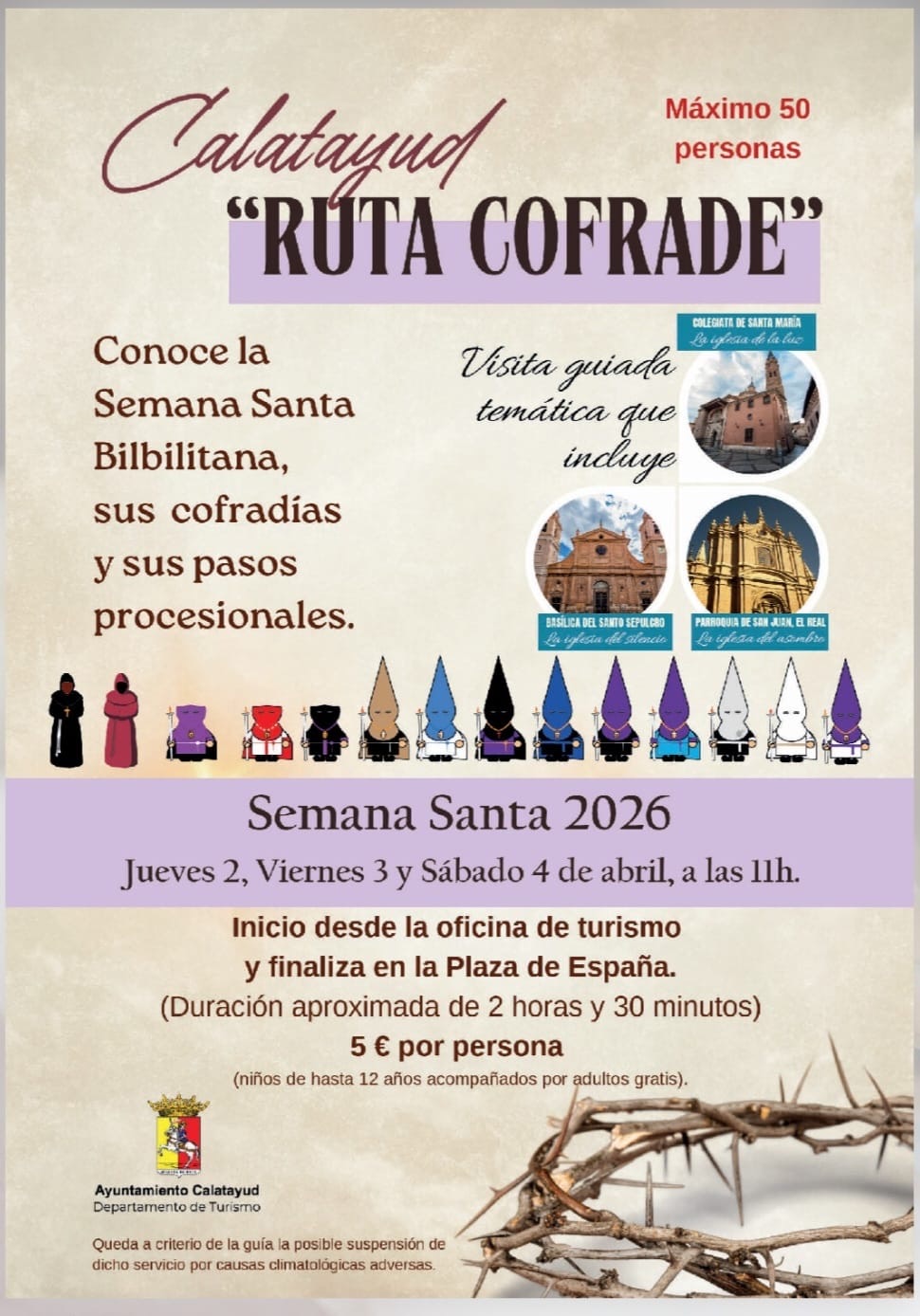 La actividad está organizada por el Ayuntamiento de Calatayud, Departamento de Turismo. La posible suspensión del servicio por causas climatológicas adversas quedará a criterio de la guía responsable de la ruta.